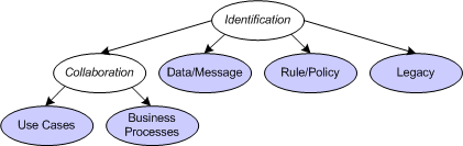 The following diagram demonstrates the differing approaches to service identification. These are not mutually exclusive, but the choices of which ones are appropriate will need to take into account wider process and project concerns. Each of the colored ovals represents one of the techniques described below. There are two forms of collaboration-based identification where the collaboration may be identified using business-process modeling or use-case modeling.